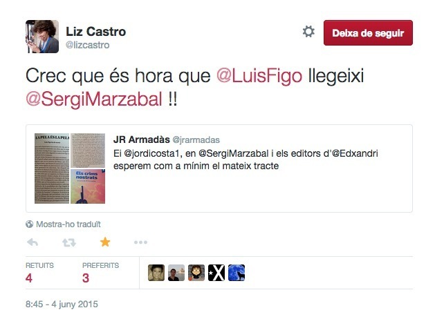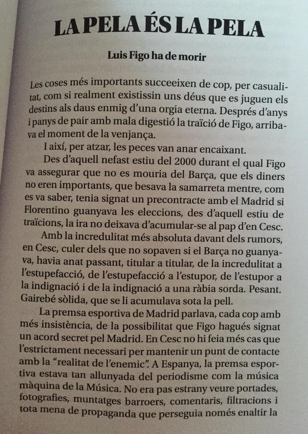 EDICIONS XANDRI va decidir el 2015 publicar un llibre de relats curts de novel·la negra en clau nostrada; relats amb una temàtica decidida per una llista de temaris inspirats en el costumari català; "Sang i fetge", "Seny i rauxa", "Ball de bastons", "Bon cop de falç", "La moreneta"... El llibre es deia CRIMS NOSTRATS Per alguna raó que encara no acabo d'entendre, EDICIONS XANDRI va pensar que seria una bona idea demanar-me que escrivís un dels relats, el de la temàtica "LA PELA ÉS LA PELA". Feia temps que em rondava pel cap un relat sobre Figo... perdó, sobre el filldeputa de Luis Figo... Així que m'hi vaig posar. El relat es va titular "LUIS FIGO HA DE MORIR" ... I moria, ja hi podeu pujar de peus que hi moria ! A la Liz Castro li va agradar... a Figo segur que no...